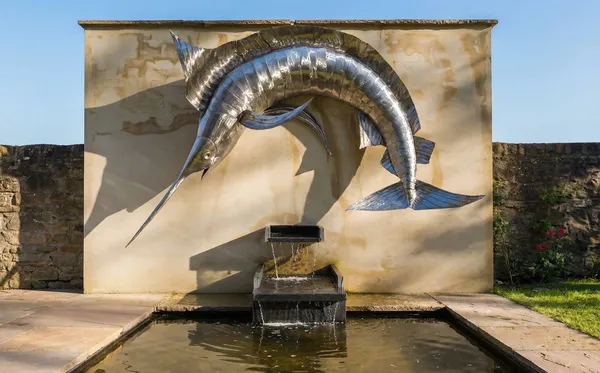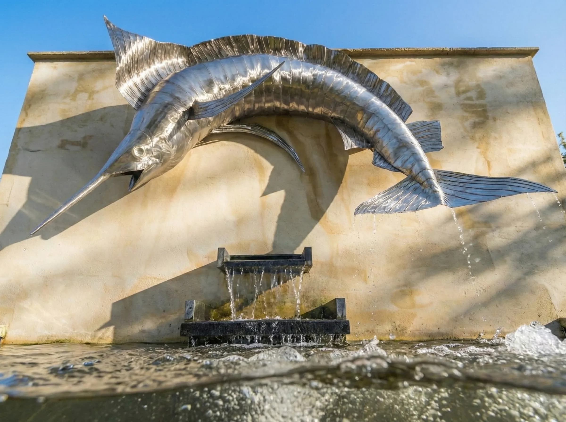 Stainless steel Blue Marlin sculpture leaping over a water feature. This life-sized piece captures the power and grace of the ocean's apex predator.