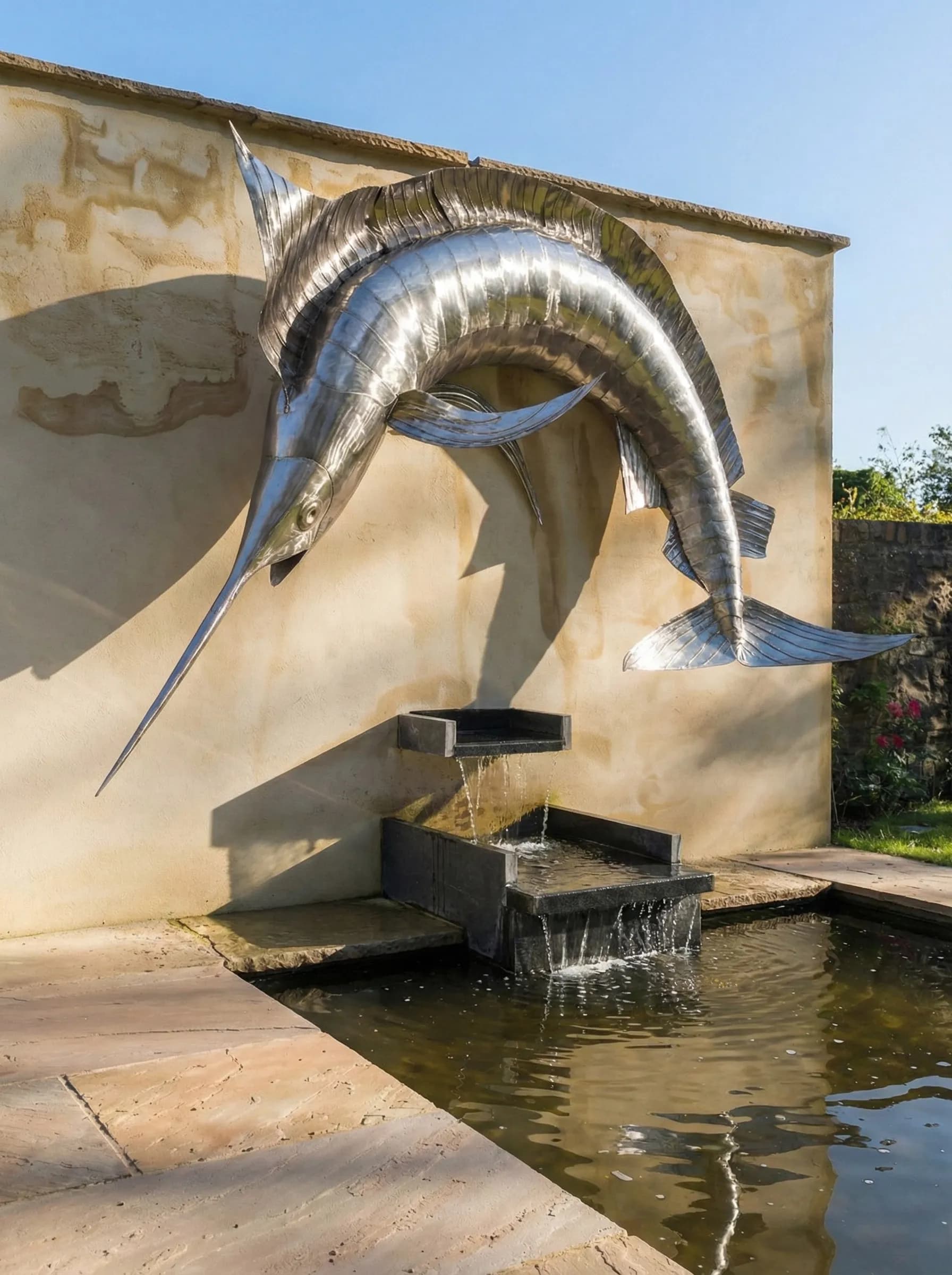 Using stainless steel, I meticulously layered the metal to replicate the sleek, hydrodynamic form of the fish. The sculpture's placement above a water feature allows the metal to catch shifting reflections, mimicking the wet shimmer of a marlin breaching the surface. This piece transforms a garden boundary into a dramatic scene of marine life, celebrating the unmatched spirit of the "king of the sea."