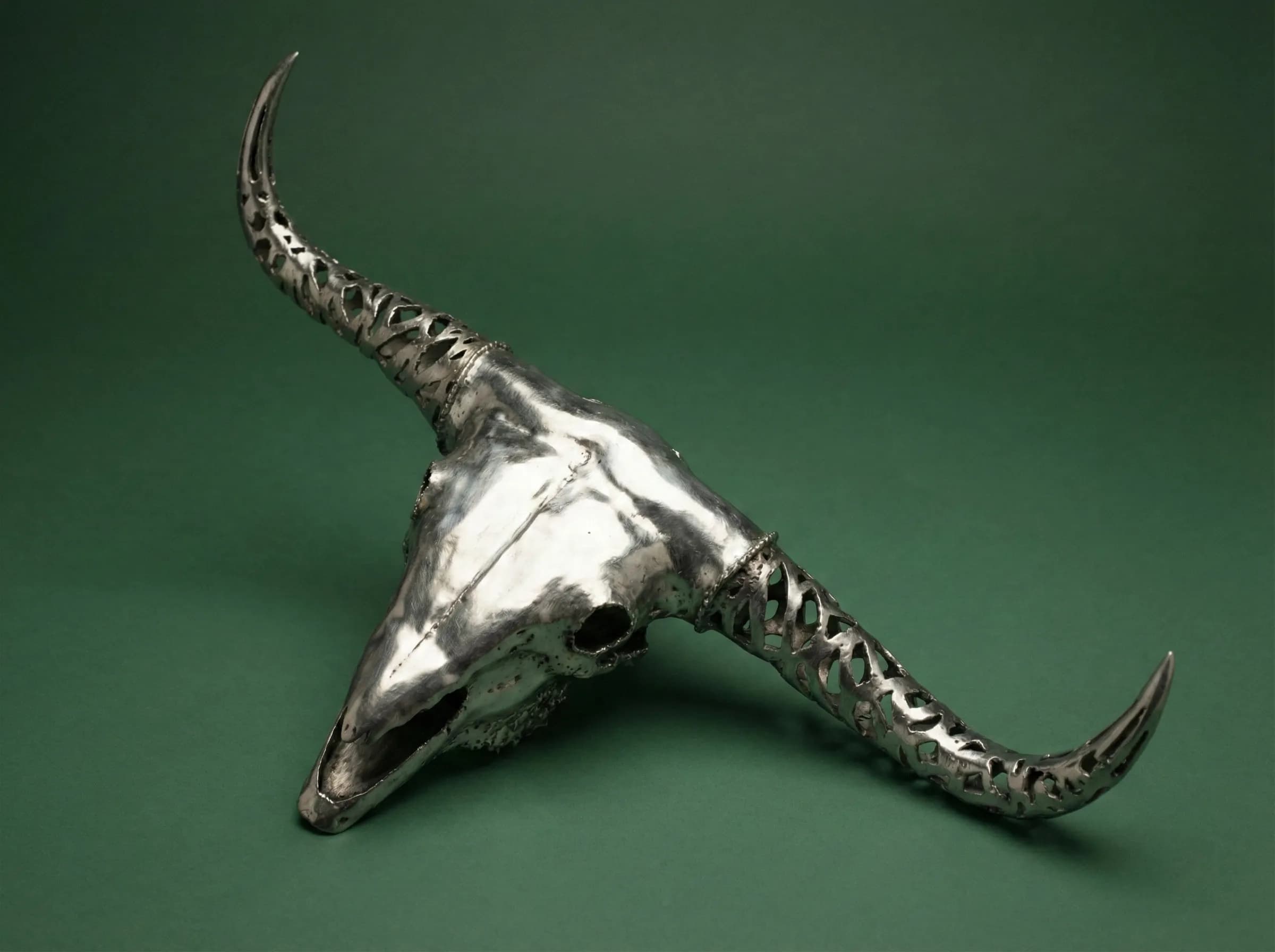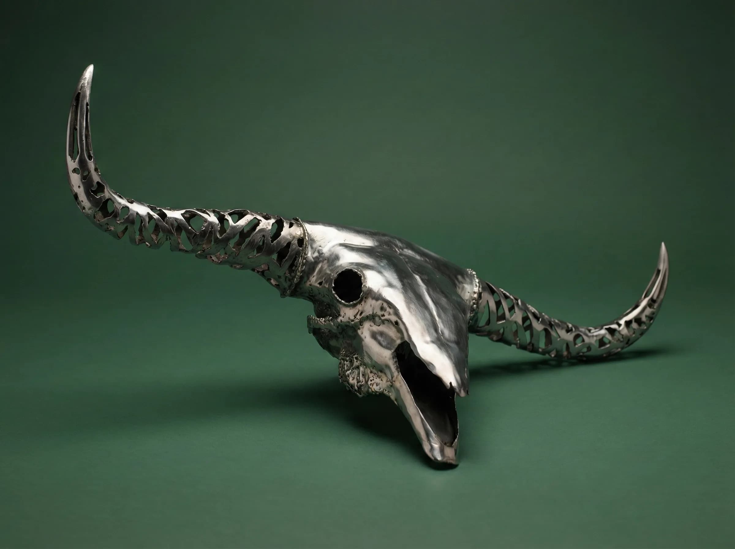 “A life-sized stainless steel sculpture of a Highland Bull skull. Featuring polished bone textures and intricate lattice-work horns.”