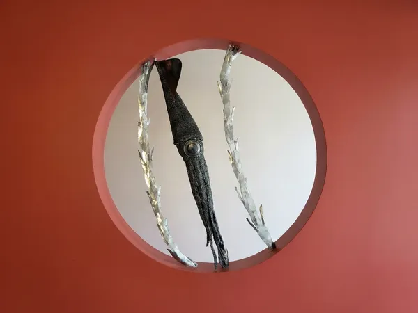 The Squid: Suspended vertically within its frame, this piece features a textured, elongated mantle, a prominent eye, and trailing tentacles. It is perfectly framed by two sweeping fronds of stylised kelp that follow the curve of the porthole.