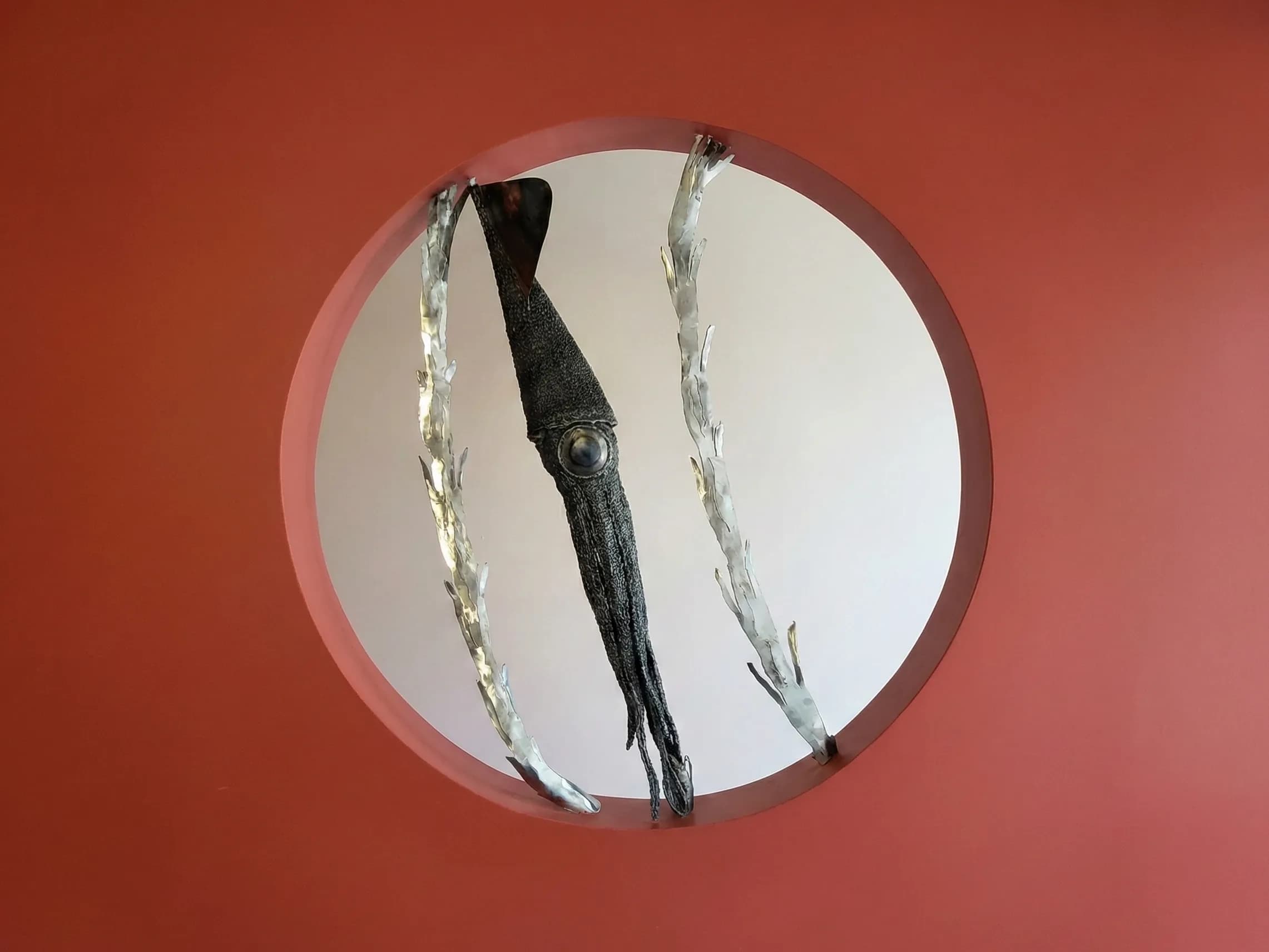 Housed within circular wall cutouts that cleverly mimic submarine portholes, these bespoke stainless steel sculptures transform a standard architectural transition into a deep-sea discovery. The installation features two distinct marine studies:
