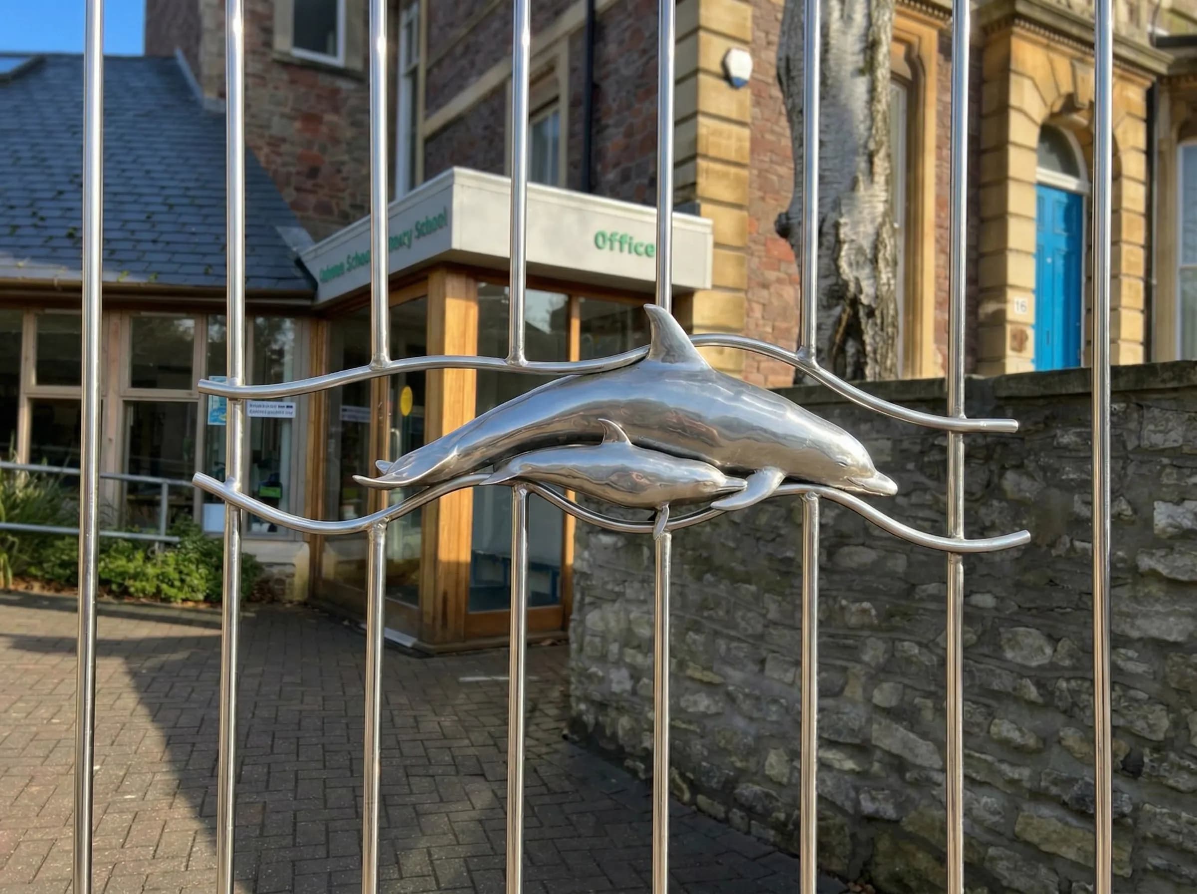 “Stainless steel dolphin sculpture commissioned for Cotham Gardens Primary School. The design is seamlessly integrated into the entrance railings.”