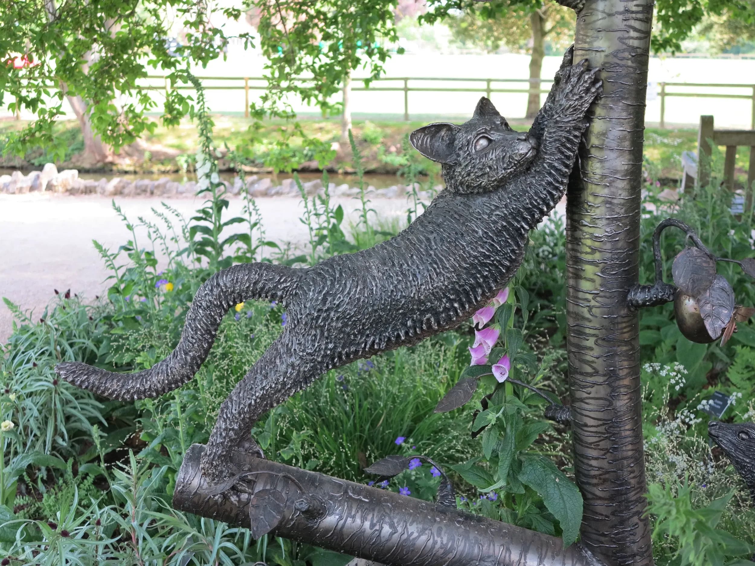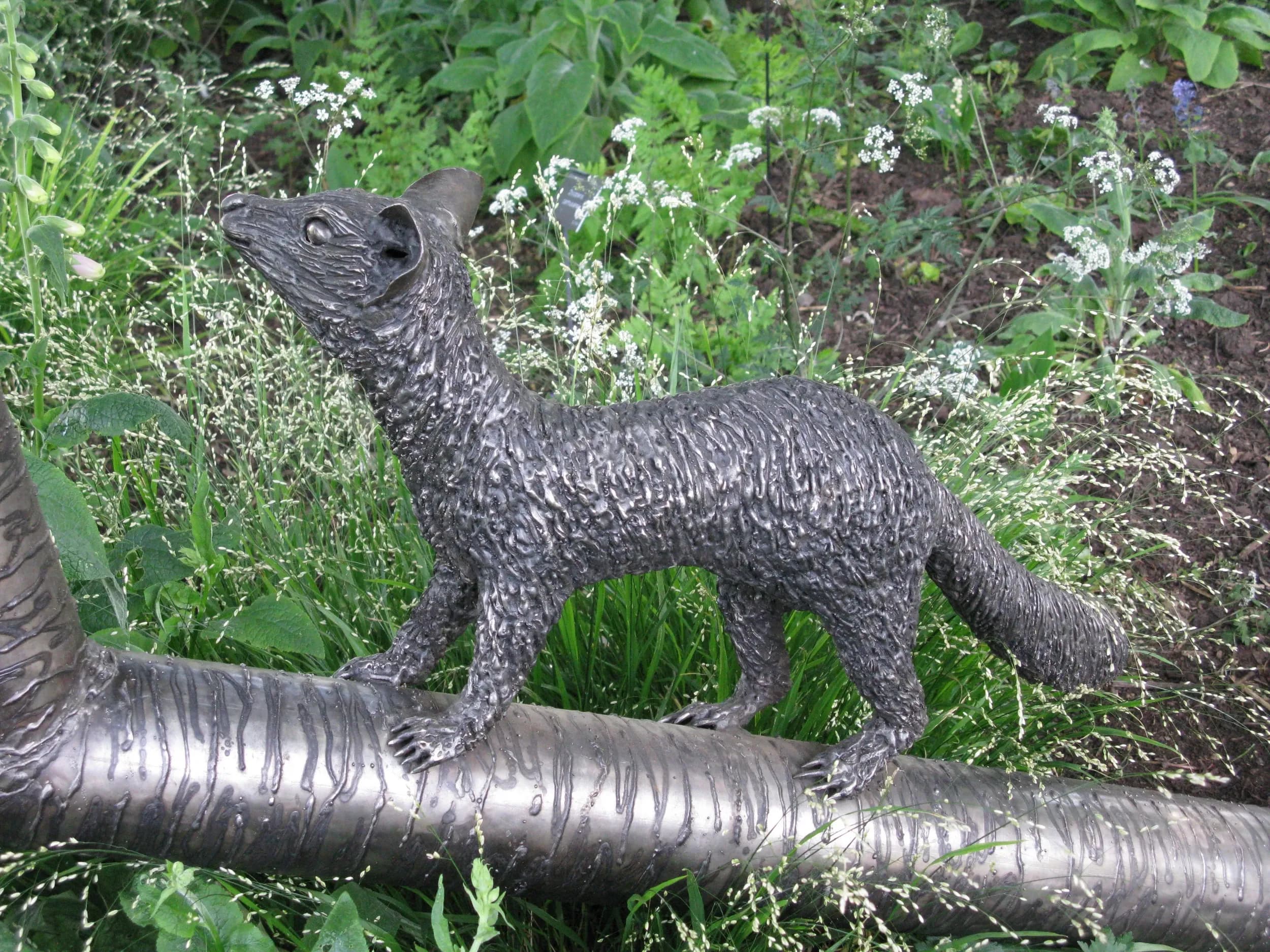 A bespoke stainless steel sculpture by Julian Warren depicting the dæmons from Philip Pullman's His Dark Materials. Located behind Lyra and Will's bench at the Oxford Botanic Garden.