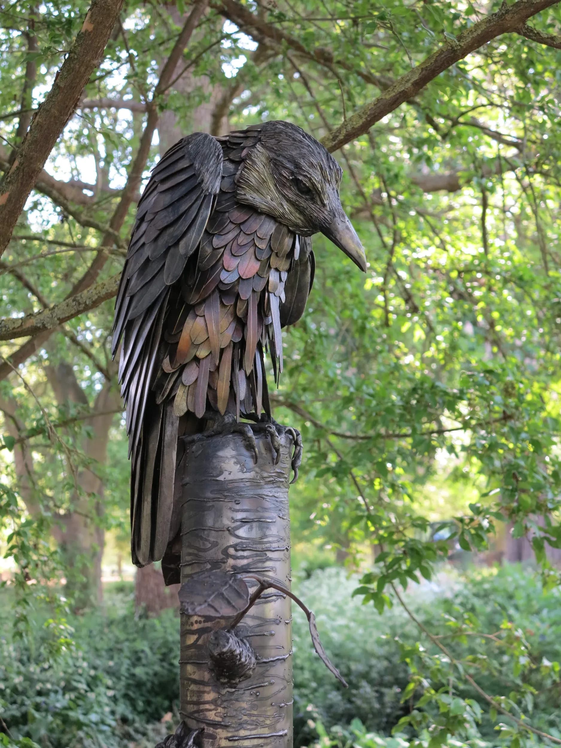 Crafted entirely by hand, the sculpture uses contrasting metalworking techniques. The heavy, bead-welded textures of the pine marten and cat mimic dense fur, while the smooth, layered plates of the raven create sleek flight feathers. As Pullman noted at the unveiling, the thousands of hours of hard graft and hammer blows give the metal its distinct soul.