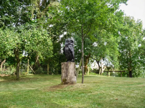 Designed to be a permanent guardian of its garden setting, the sculpture focuses on the owl's intense, forward-facing gaze and its iconic "ear" tufts. Perched atop a natural wooden stump, the reflective and heat-tinted steel interacts beautifully with the shifting garden light, ensuring this silent hunter remains a focal point of the landscape throughout the seasons.