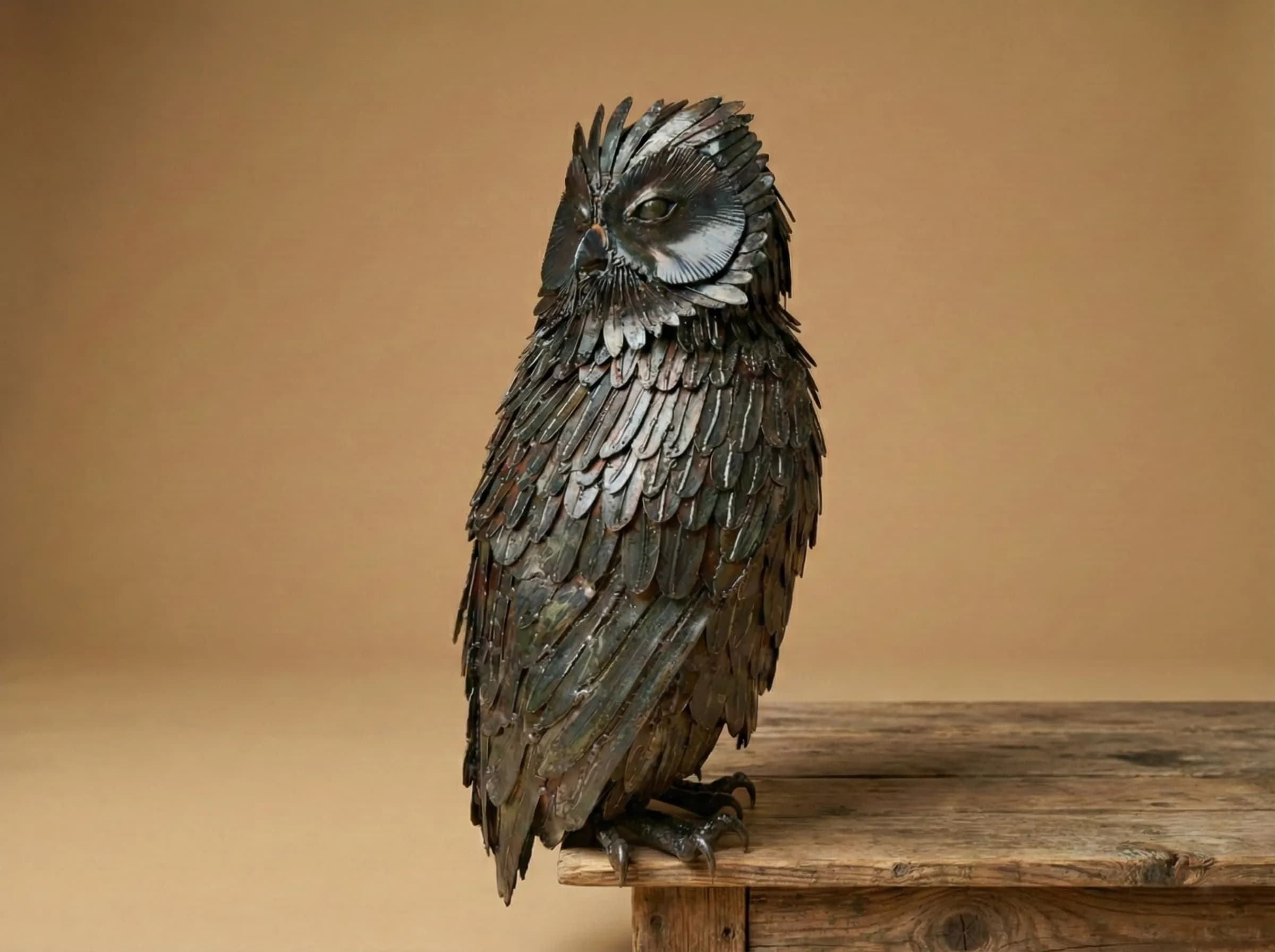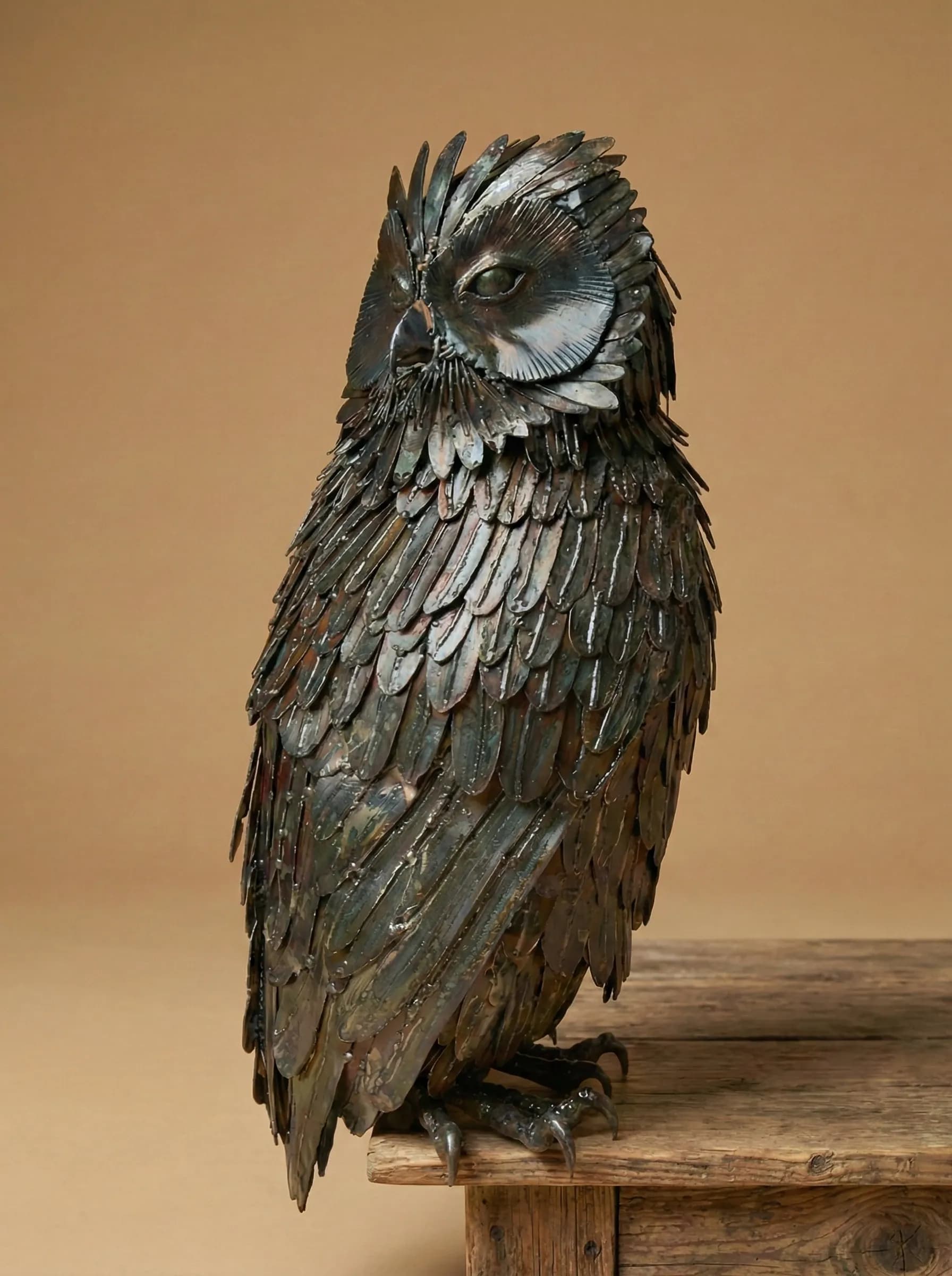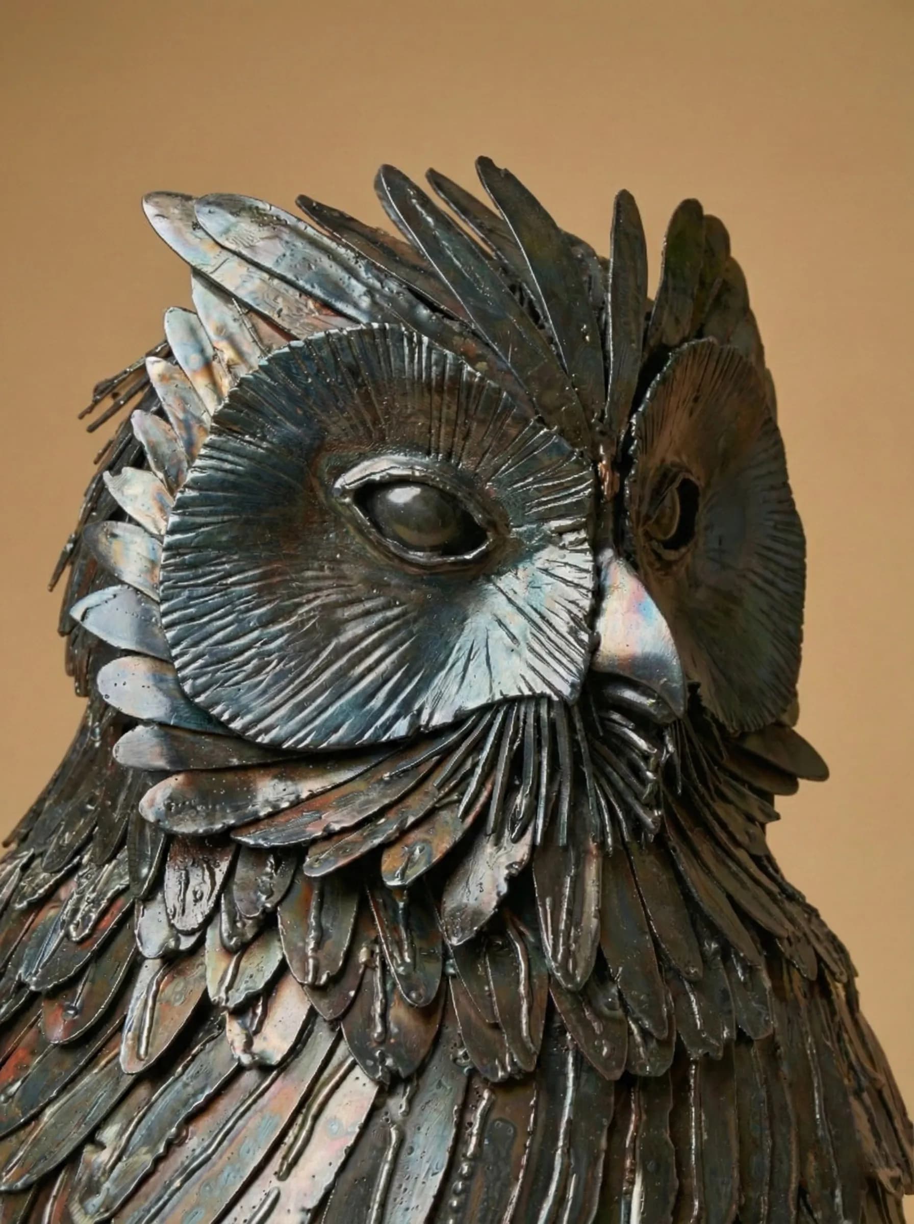 In this piece, I utilized stainless steel to capture the intricate, layered density of the owl's plumage. Each feather was individually shaped and textured to recreate the soft yet robust appearance of the bird’s wings and breast. To achieve the deep, mottled tones of the "eagle owl," the steel was carefully heated, resulting in a range of earthy ambers and dark bronzes that provide a lifelike depth to the metallic surface.