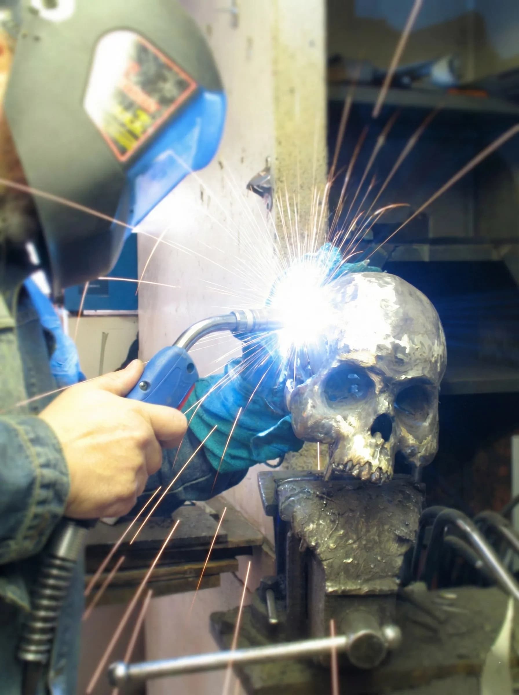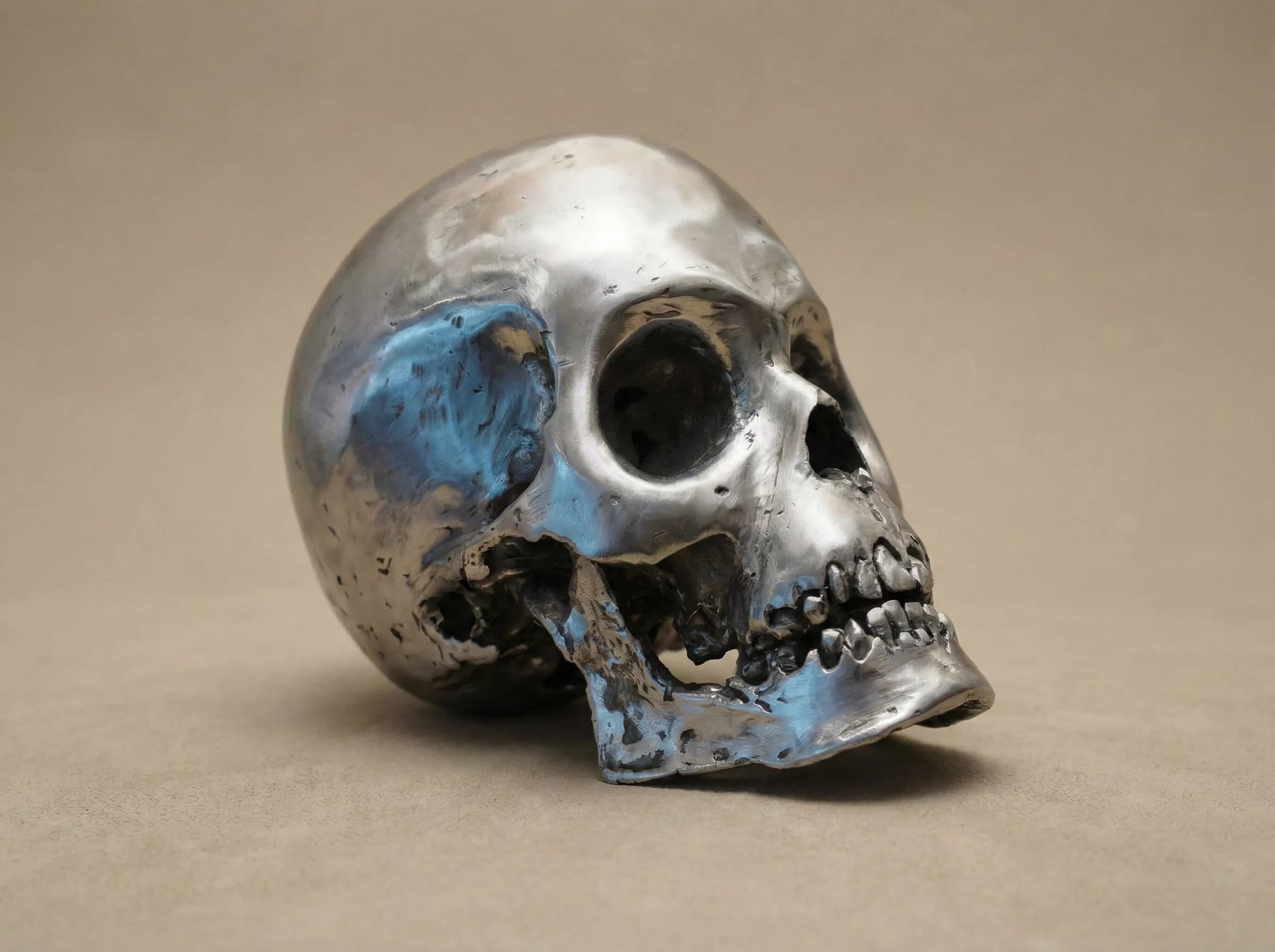 A life-sized stainless steel human skull sculpture. A polished anatomical study exploring the boundary between medical science and evolution.