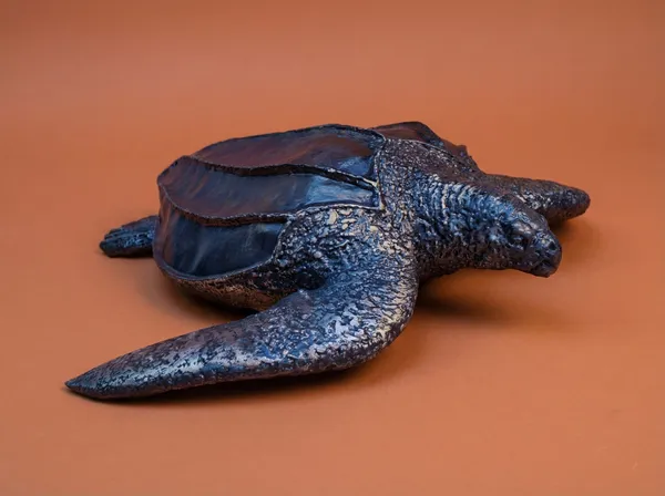 Stainless steel Leatherback Turtle sculpture. Life-sized, heat-tinted piece captures the unique ridged shell and powerful flippers of the ocean giant.