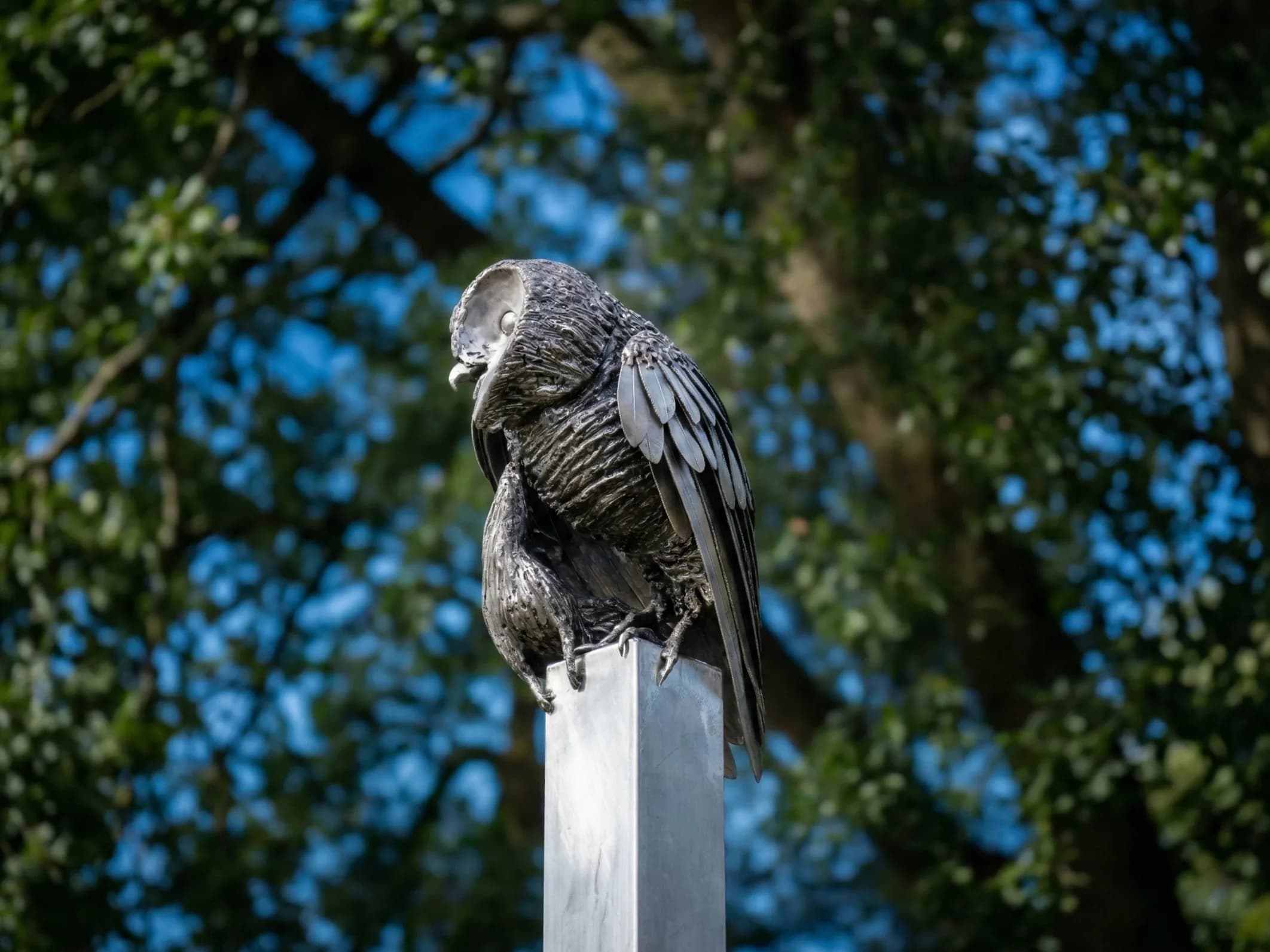 “A striking stainless steel sculpture of a Barn Owl clutching its caught prey. Commissioned for Bristol University's Royal Fort Gardens.”