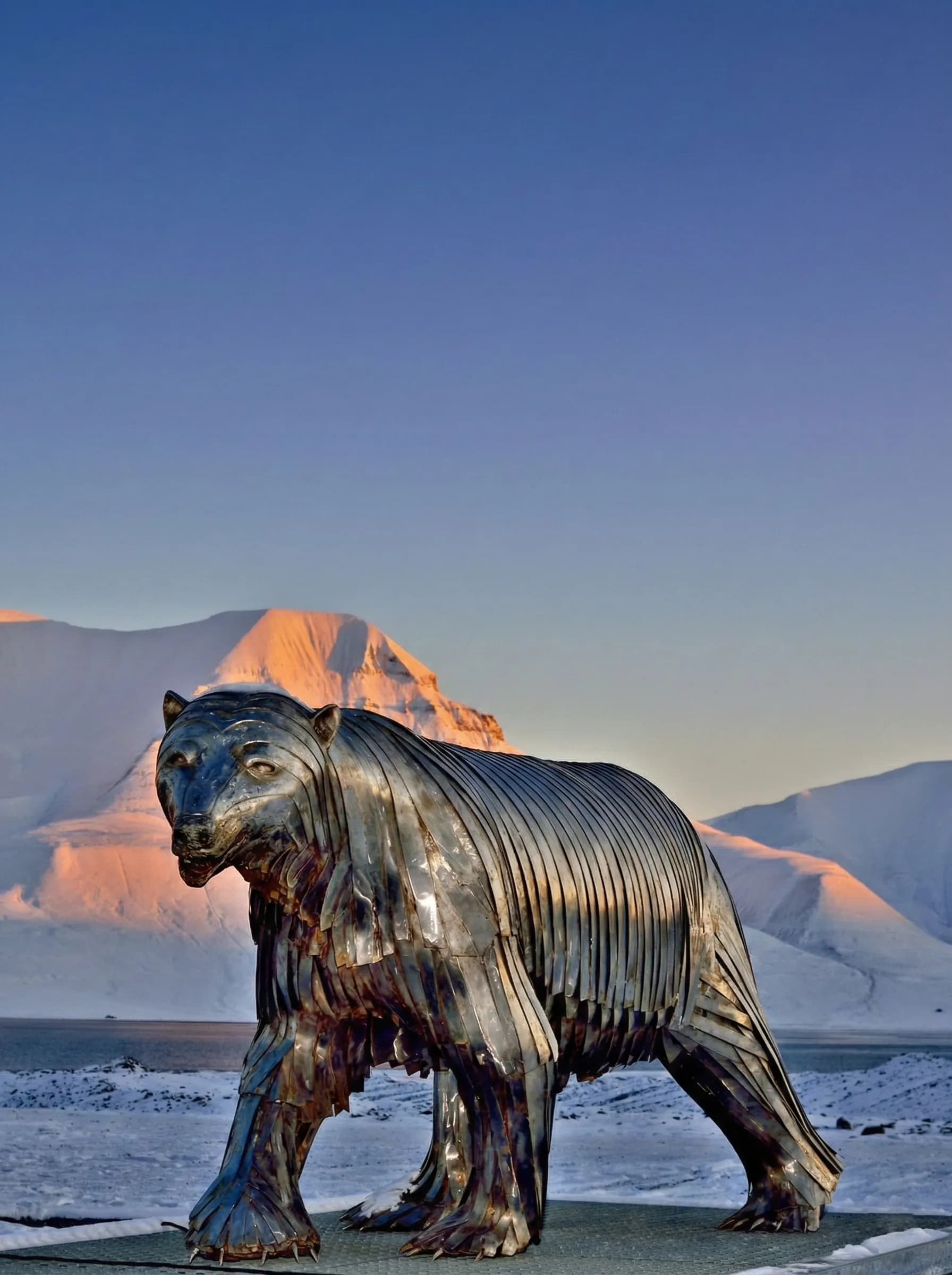 A majestic stainless steel polar bear in Svalbard. A landmark sculpture symbolizing Arctic conservation and climate change awareness in Longyearbyen.