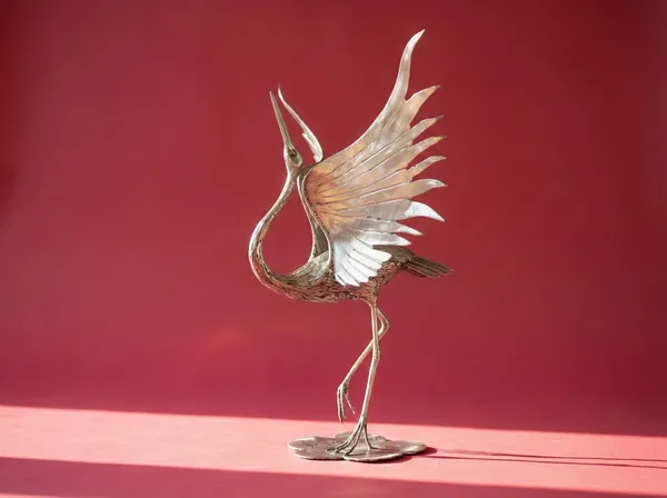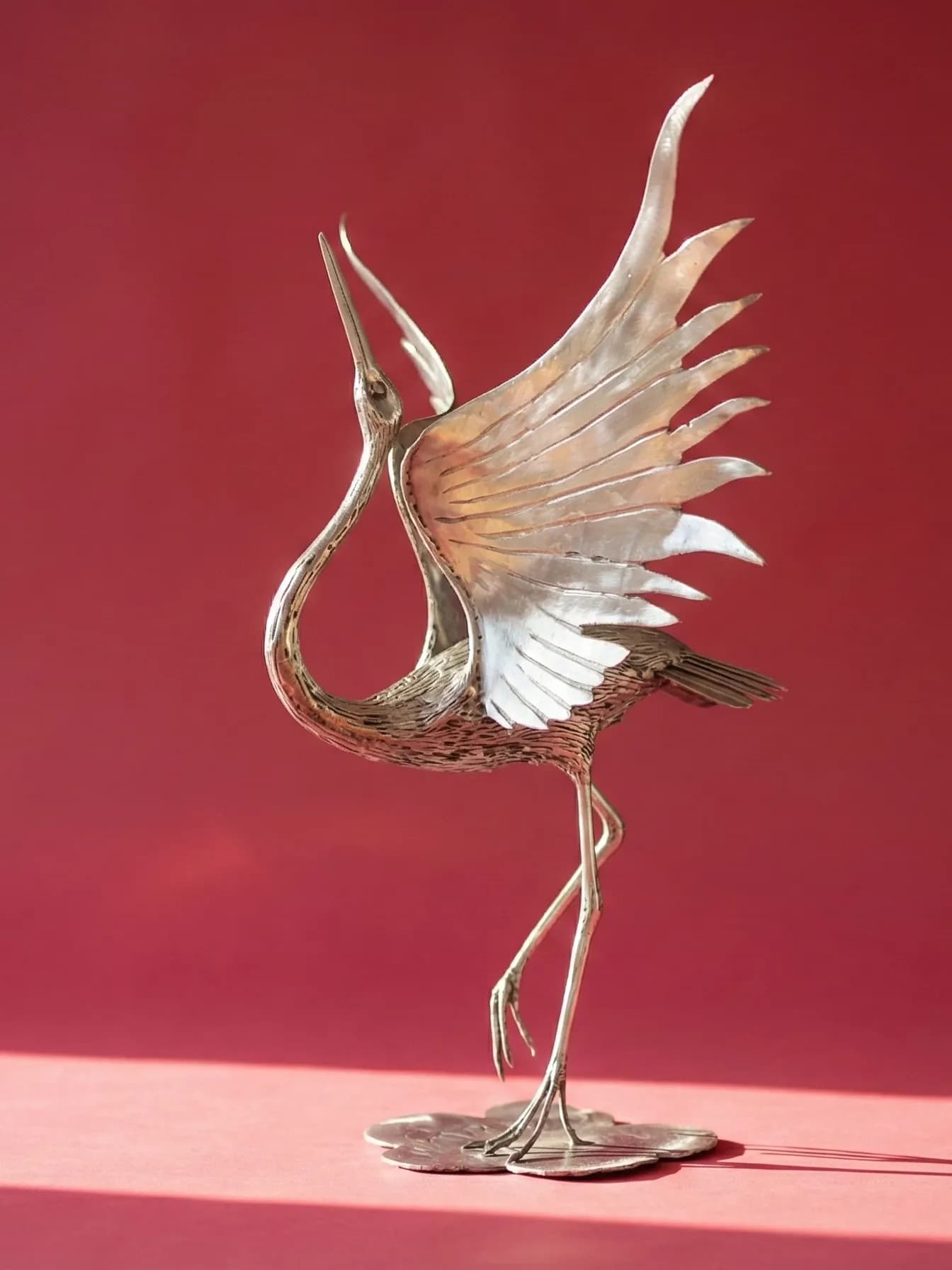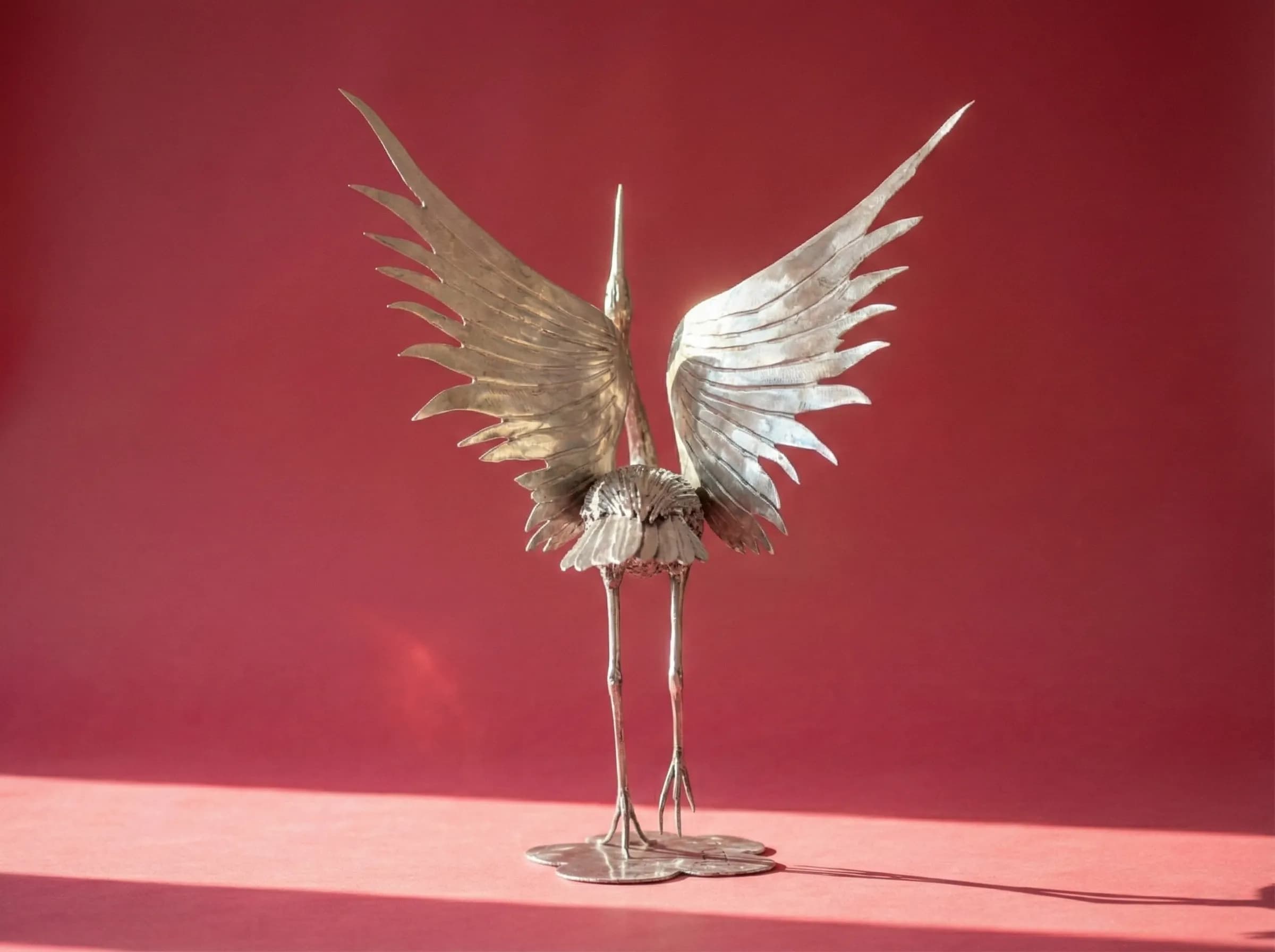 “Stainless steel sculpture of a Japanese Red-Crowned Crane in mid-dance. Features contrasting polished wings and a textured, bead-welded body.”