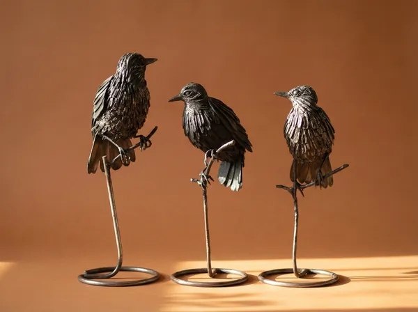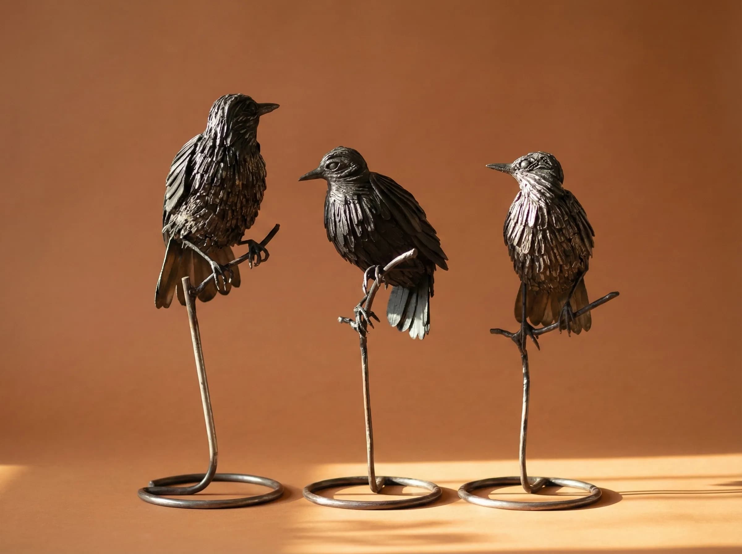 Rather than mounting them on heavy, naturalistic branches, this trio is perched on delicate, hand-forged circular steel loops. This minimalist presentation gives the sculptures a clean, contemporary feel, making them perfect for an indoor display where their subtle character can be appreciated up close.