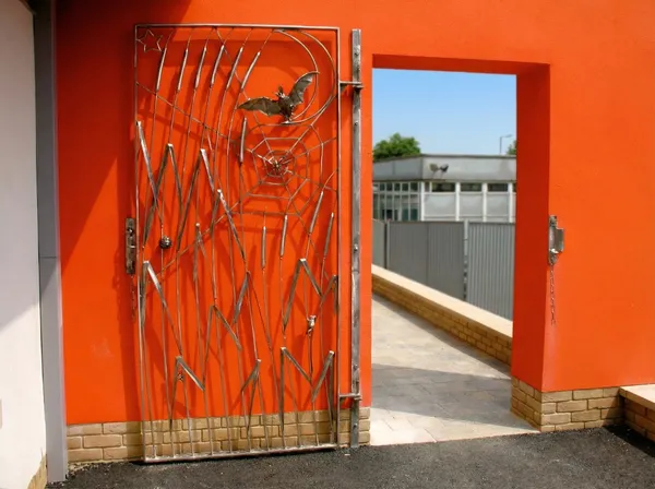 “A gate commissioned for Kings Forest Primary School. Features intricate web design and hidden wildlife sculptures including a bat, bird, and insects.”