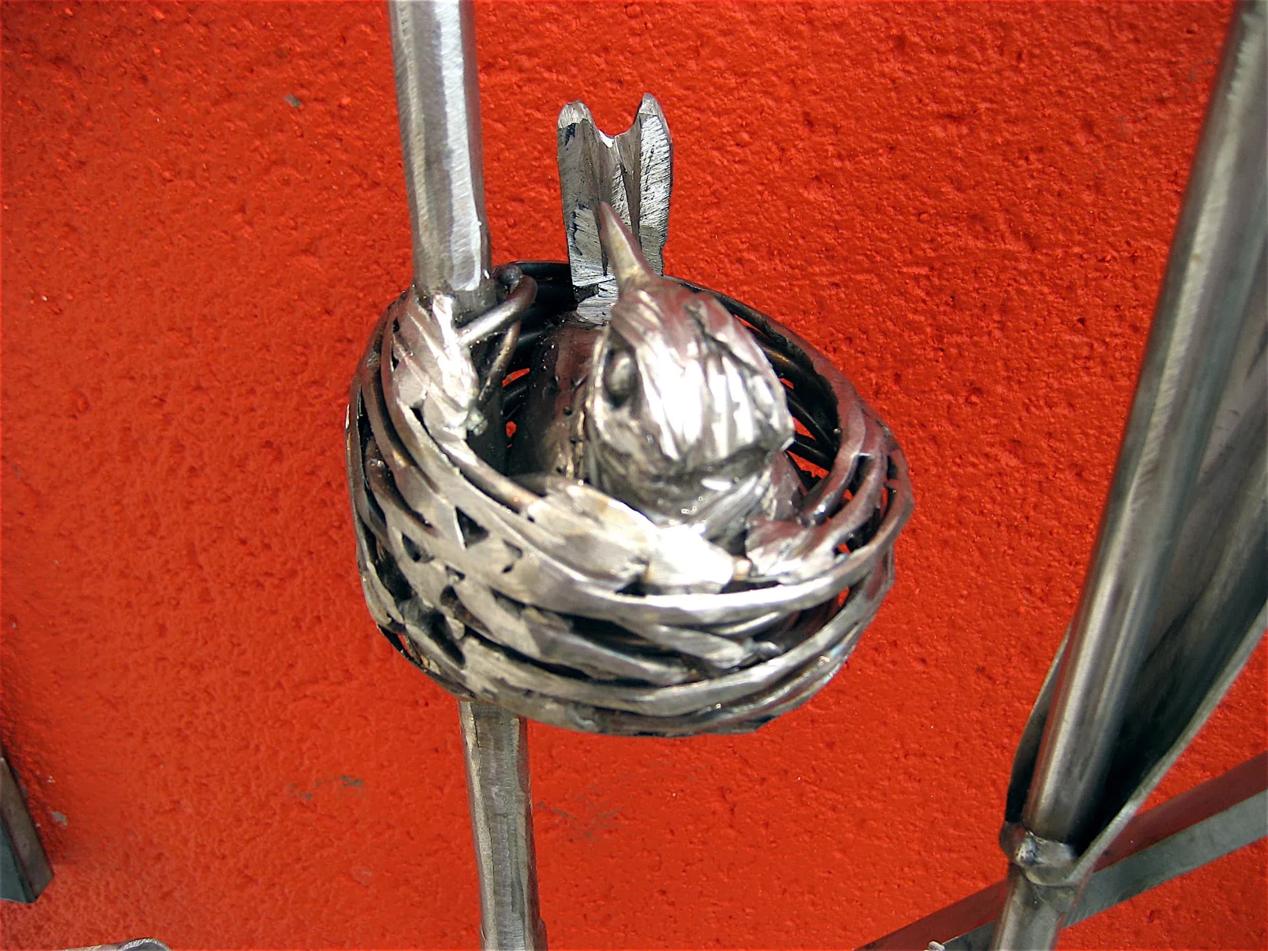 Hidden throughout the gate, students can discover a variety of native wildlife. A large, heavily textured bat swoops across the upper frame, its smooth wings contrasting against its bead-welded body. Lower down, a tiny bird sits tight in a woven metal nest, while an intricately detailed insect navigates the stems of the bulrushes. This piece transforms a mundane security feature into a daily point of discovery.