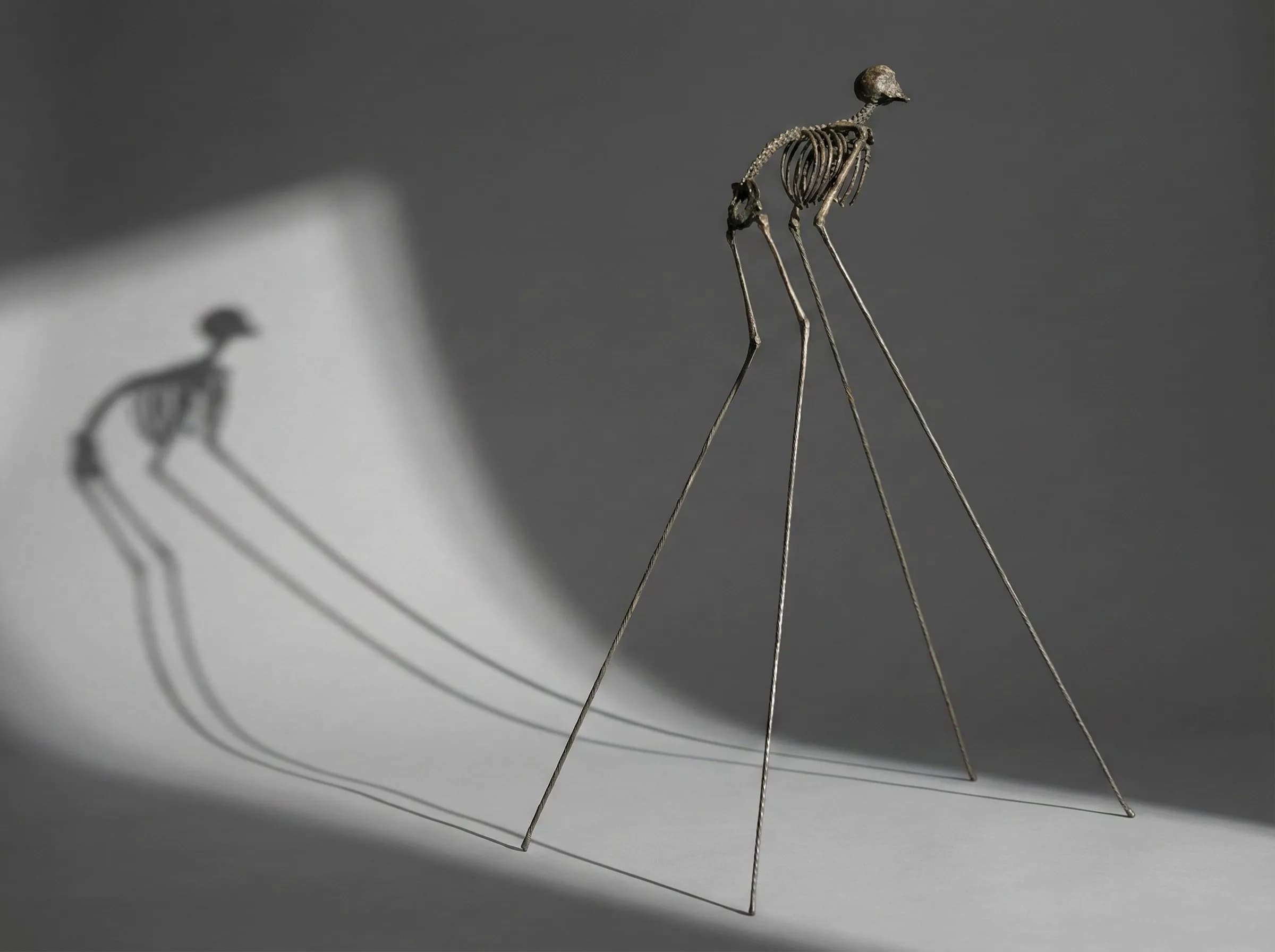 Crafted from stainless steel, the figure is defined by its exaggerated, stilt-like limbs which give it a precarious, towering silhouette. The body is stripped back to a raw, anatomical cage—an exposed spine and ribcage rendered with heavy, beaded welding to mimic the texture of excavated bone or decaying matter. Topped with a humanoid skull, this Jabberwocky blurs the line between man and monster, casting a long, distortion-heavy shadow that is as much a part of the piece as the steel itself.