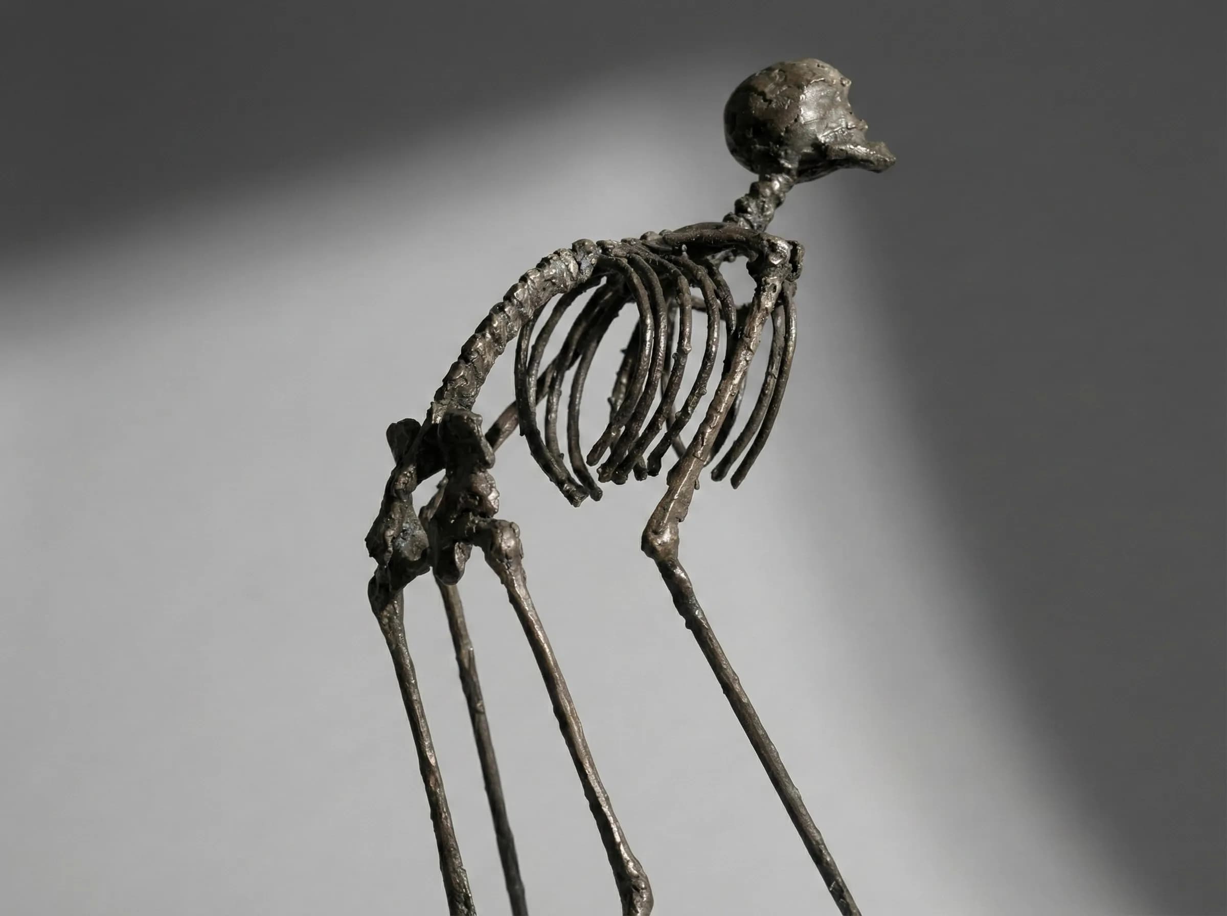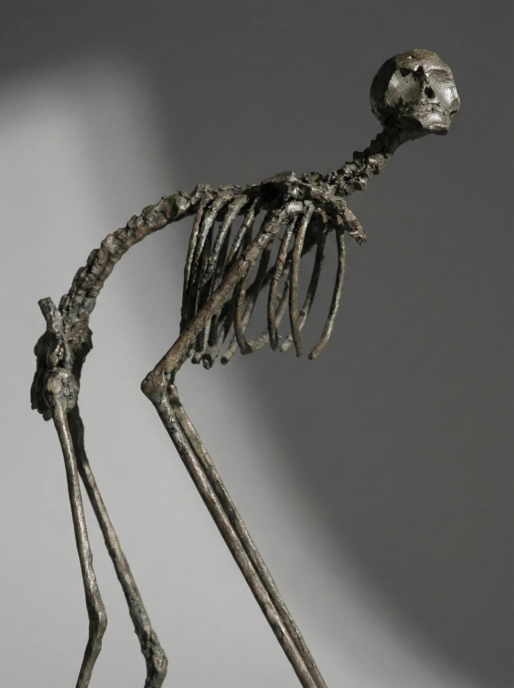 “A dark, skeletal re-interpretation of Lewis Carroll's Jabberwocky. This surrealist stainless steel sculpture features elongated limbs and a textured, bone-like finish.”