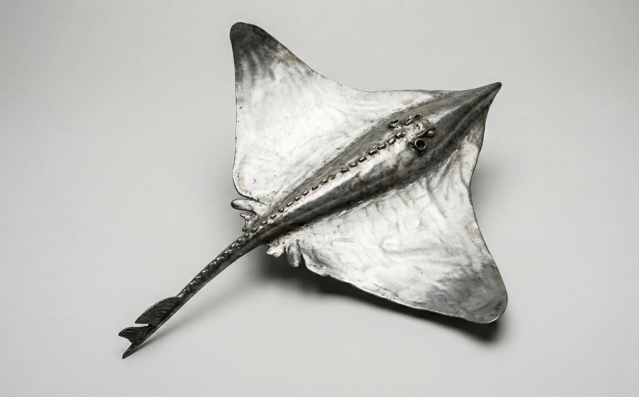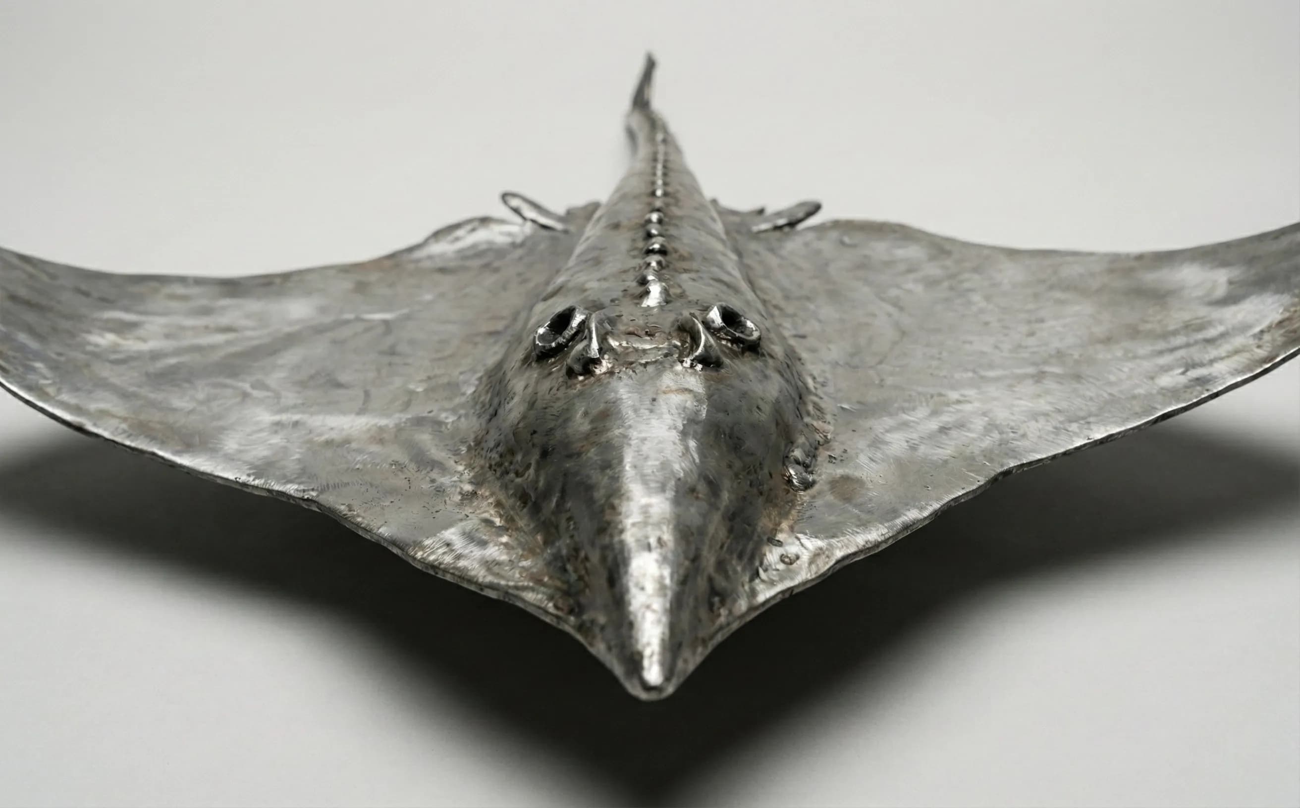“A life-sized stainless steel Thornback Ray sculpture. This piece captures the sweeping fins and defensive spines of this iconic Atlantic species.”